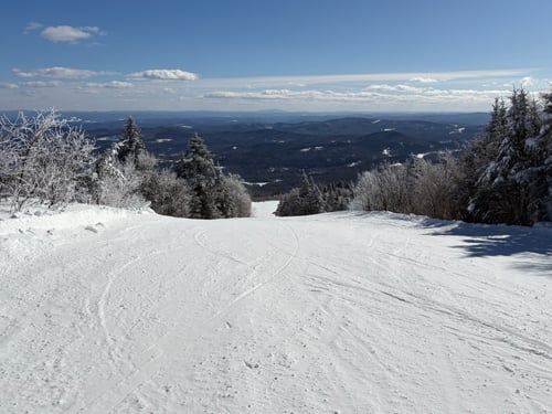 It's the only easy trail from the South Face summit, but there are some steeper parts which may make you question that rating. (It was rated as intermediate until 2003). It's not as scenic as longer summit trails like Upper Mountain Road or Tuckered Out, but it's a nice relaxing alternative to the many advanced trails on South Face.